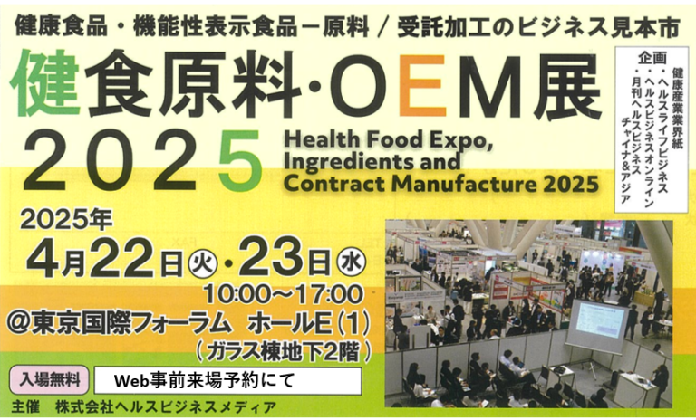 4月16日(木)・17日(金) 東京国際フォーラムにて開催される “健食原料・OEM展 2026”に出展いたします。ご来場の際は、是非 弊社ブース 小間No.D16にお立ち寄りください。詳しくはこちらから